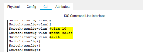 To create a VLAN globally type the vlan [number]. This will create the vlan and enter the vlan configuration. In this case we will create a Vlan 10 and name it sales by using the command name sales. Now exit from vlan configuration