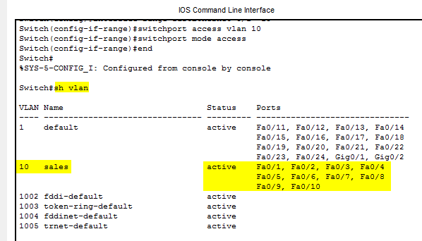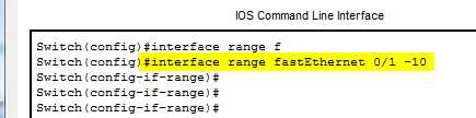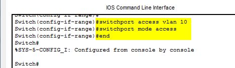 In this shorter way we skip the initial creation of the Vlan. Instead we just define the interface range and then assign them to our Vlan to the interfaces with the switchport access vlan [number] command.