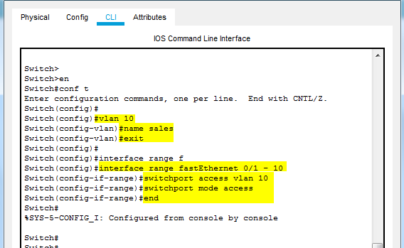 Define the interfaces that we will be assigning to the vlan shortly. In our case the sales department will be using the first 10 interfaces, or ports, on the switch.
