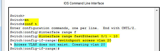 Vlan 20 was created the shorter way by defining the interface range and then associating those interfaces with Vlan 20. Knowledge of both methods are required if sitting the CCNA exam.