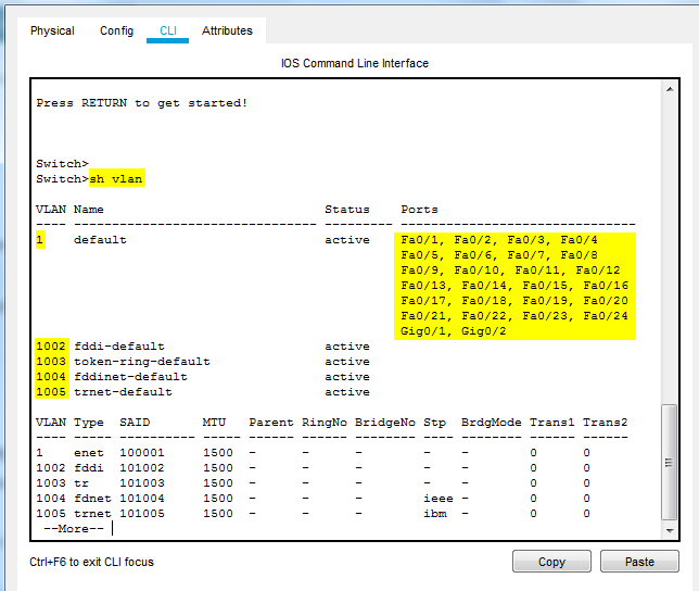 Use the show vlan command to see all the configured vlans. As you will see Vlan 1 and Vlan 1002 to 1005 are configured by default.
