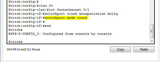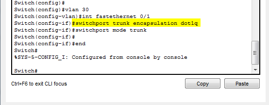 In the following example I created Vlan 30, assigned it the FA0/1 interface and then I statically assigned it the encapsulation 802.1q. (This particular switch doesn’t support ISL and therefore the negotiate command wont work either.)